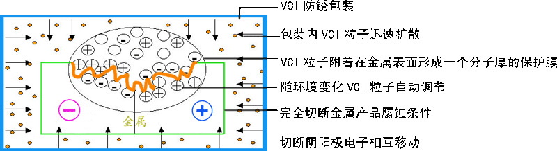 VCI是英文(Volatile Corrosion Inhibitor)的縮寫(xiě),它是一種具有揮發(fā)性的腐蝕抑制劑,簡(jiǎn)稱(chēng)為氣化性防銹產(chǎn)品。當(dāng)用氣化性防銹產(chǎn)品包裝好被包裝物以后,防銹產(chǎn)品的防銹粒子氣化成氣體,吸附在金屬表面形成保護(hù)膜,切斷金屬離子與水、氧氣接觸的可能性,有效抑制了金屬腐蝕電化學(xué)反應(yīng)的發(fā)生,從而達(dá)到防銹效果。包裝后內(nèi)部的防銹粒子的氣化擴(kuò)散量自動(dòng)調(diào)節(jié),當(dāng)濕度或溫度增大時(shí),防銹粒子的擴(kuò)散量也會(huì)加大, 反之,防銹粒子的擴(kuò)散量會(huì)減小,從而來(lái)自動(dòng)調(diào)節(jié)包裝物內(nèi)部的氣體濃度,讓包裝物始終處于一種最穩(wěn)定的防銹狀態(tài)。