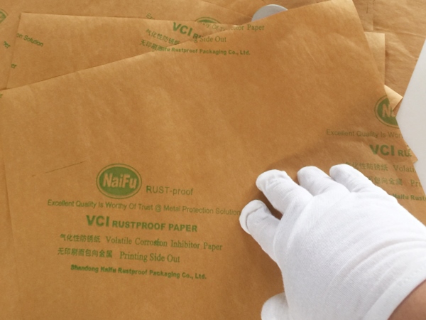 4、包裝過程---將含有緩蝕劑的面朝向金屬包裝,不覆膜防銹紙可作為金屬產(chǎn)品間墊層隔材使用,以免其他材質阻隔材料含S、CL化學成分,影響防銹效果